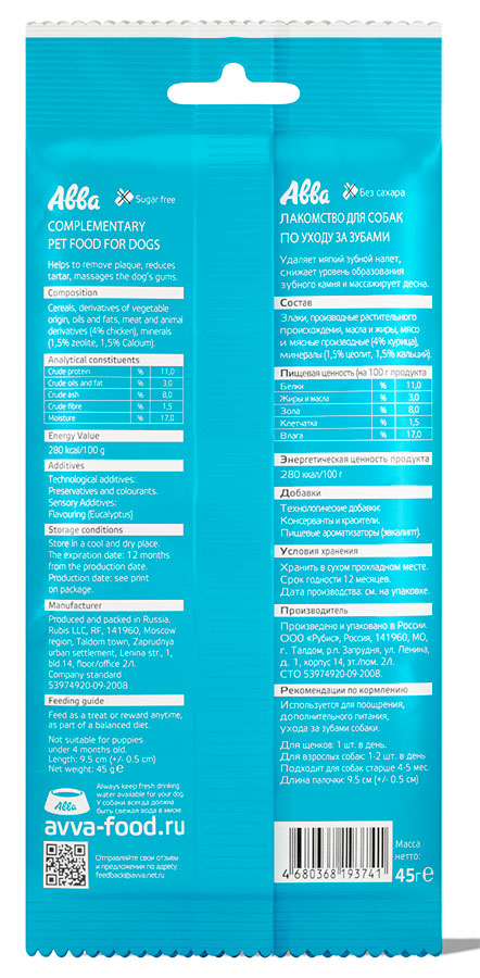 Лакомство Авва Дентал – это натуральное лакомство, служащее аналогом зубной пасты и очищающие зубы собаки. Палочки обогащены кальцием и способствуют укреплению зубов. В упаковке – 3 палочки.