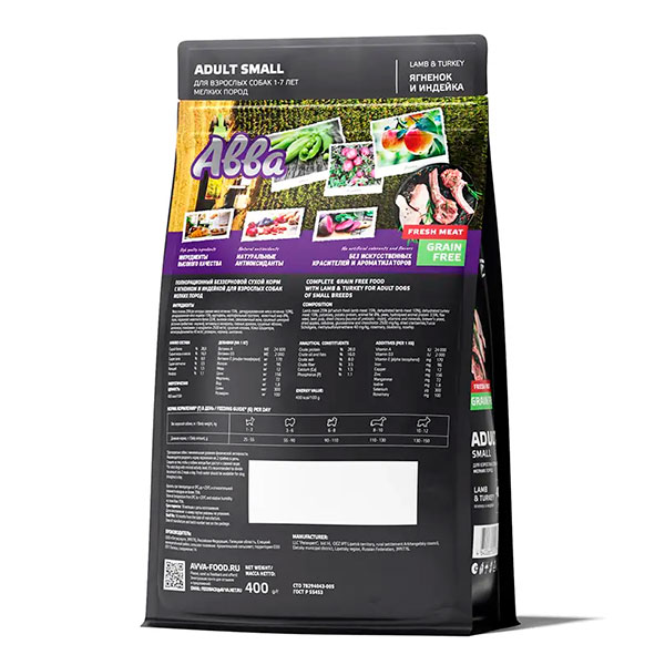 АВВА Holistic – это полнорационный корм для взрослых собак мелких пород, изготовлен на основе свежего мяса (15%).  Корм сбалансирован по количеству жиров и протеинов, учитывает особенности развития собак мелких пород, предупреждая набор лишнего веса. Приготовлен без использования злаков, что снижает вероятность возникновения аллергических реакций. Небольшой размер гранул позволяет с лёгкостью наслаждаться приёмом пищи.