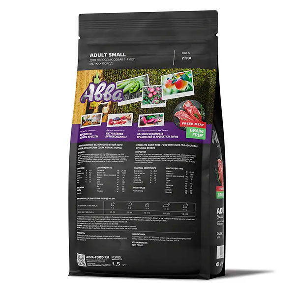 АВВА Holistic – это полнорационный корм для взрослых собак мелких пород, изготовлен на основе свежего мяса (20%).  Корм балансирован по количеству жиров и протеинов, учитывает особенности развития собак мелких пород, предупреждая набор лишнего веса. Приготовлен без использования злаков, что снижает вероятность возникновения аллергических реакций. Небольшой размер гранул позволяет с лёгкостью наслаждаться приёмом пищи.