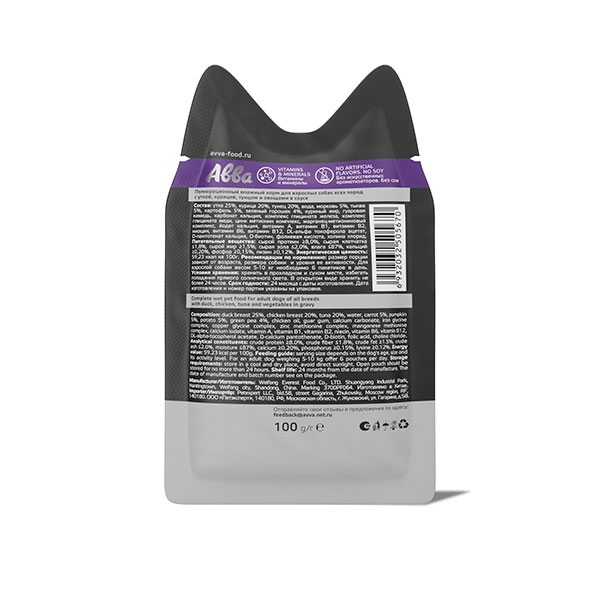 АВВА паучи с уткой, курицей, тунцом и овощами в соусе - полнорационный влажный корм для собак всех пород. Нежные волокна в аппетитном соусе, приготовленные до идеально мягкой консистенции, подарят истинное удовольствие вашему питомцу.