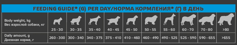 При переходе на корм АВВА постепенно вводите его в рацион собаки в течение 4-5 дней. Разделите дневную норму, указанную в таблице, на количество кормлений в день. Придерживайтесь рекомендуемых норм кормления, индивидуальная норма кормления Вашей собаки зависит от ее возраста, условий содержания, темперамента и активности. У собаки должна быть постоянно чистая и свежая вода для питья. Корм полнорационный и сбалансированный, поэтому дополнительное добавление витаминов или минералов в рацион собаки не требуется.
