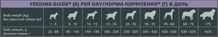 При переходе на корм АВВА постепенно вводите его в рацион собаки в течение 4-5 дней. Разделите дневную норму, указанную в таблице, на количество кормлений в день. Придерживайтесь рекомендуемых норм кормления, индивидуальная норма кормления Вашей собаки зависит от ее возраста, условий содержания, темперамента и активности. У собаки должна быть постоянно чистая и свежая вода для питья. Корм полнорационный и сбалансированный, поэтому дополнительное добавление витаминов или минералов в рацион собаки не требуется.