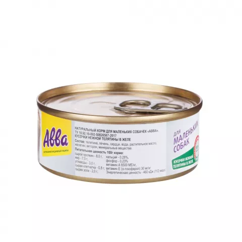 Натуральный корм для собак мелких и карликовых пород АВВА кусочки нежной телятины в желе учитывает особенности питания подобных животных.