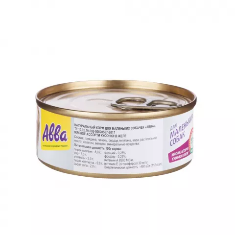 Натуральный корм для собак мелких и карликовых пород АВВА мясное ассорти кусочки в желе учитывает особенности питания подобных животных. Для полноценной и активной жизни, ваши домашние животные небольшого размера должны получать достаточно питательных элементов и витаминов, но при этом объем их желудка не велик. Корм для таких собак должен иметь высокую концентрацию всех необходимых элементов питания, достаточно нежную мелкую текстуру, учитывая небольшой размер челюсти питомца. Всё это учтено в корме «АВВА». Удобная небольшая упаковка не требует хранения в холодильнике (в закрытом виде), имеет долгий срок годности, для того, чтобы ее открыть не понадобится консервный нож.
