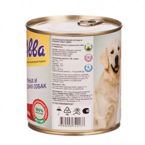 Консервированный корм АВВА с говядиной предназначен для взрослых собак любых пород.