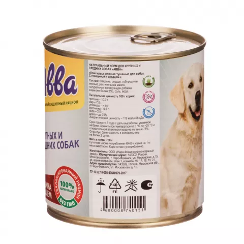 Консервированный корм АВВА с говядиной с сердцем предназначен для взрослых собак крупных и средних пород.