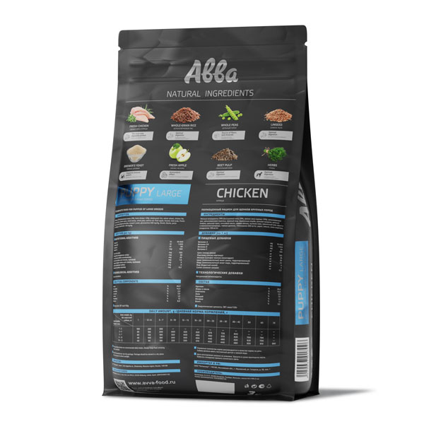 ABBA Natural Ingredients Puppy Large – это полнорационный корм со свежим мясом курицы и с высоким содержанием натуральных ингредиентов, разработанный специально для щенков крупных пород. Корм сбалансирован по составу и количеству витаминов и питательных веществ для быстрорастущего организма. Высокое количество протеина способствует быстрому насыщению и правильному развитию мышечного корсета.